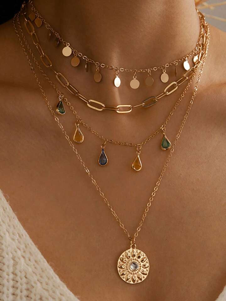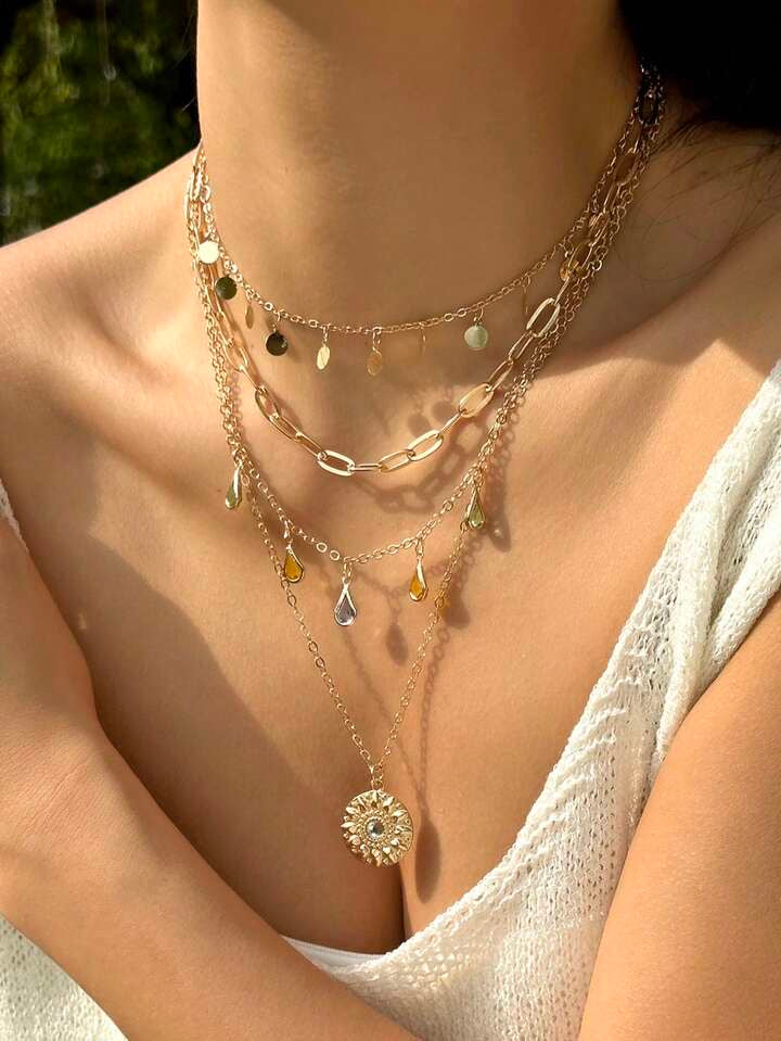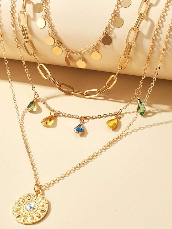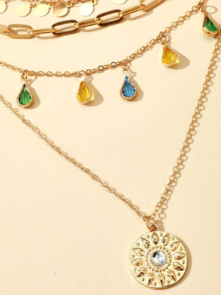 1pc Geometric Circle Tassel Necklace, Alloy Ring Rhinestone Tassel Uneven Circle Pendant 4 Layer Chain