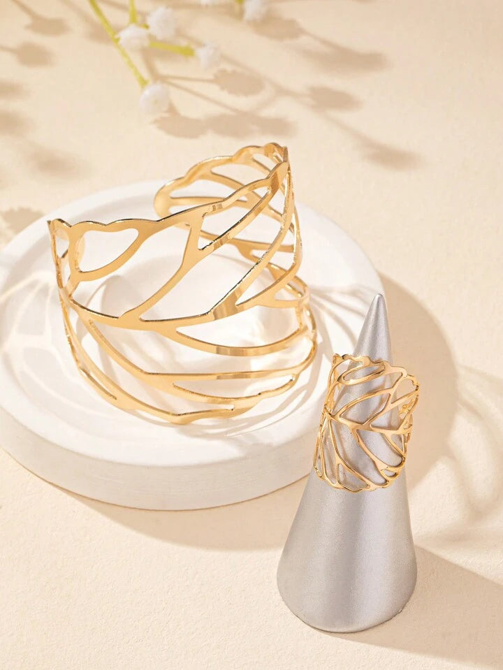 1pc Metal Fashion Geometric Leaf Bracelet And 1pc Metal Fashion Geometric Leaf Ring