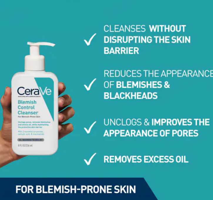 The daily cleanser contains 3 Essential Ceramides, Niacinamide and 2% Salicylic Acid Formulated with an oil-absorbing technology using Hectorite Clay, CeraVe Blemish Control Cleanser helps remove dirt and excess oil, to minimise shine
