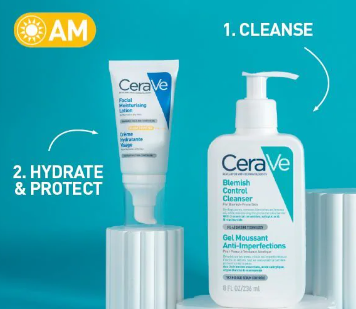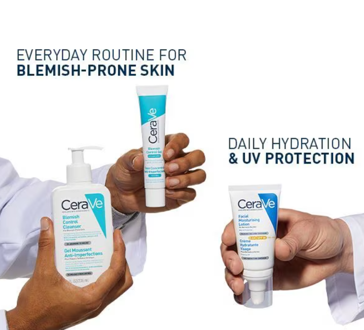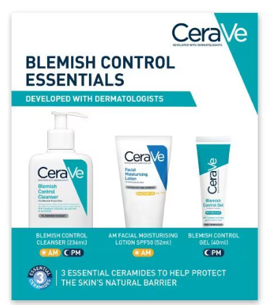 The Kit Contains; Cerave Blemish Control Cleanser 236Ml, Cerave Blemish Control Gel 40Ml, Cerave Facial Moisturiser Spf50 52Ml.