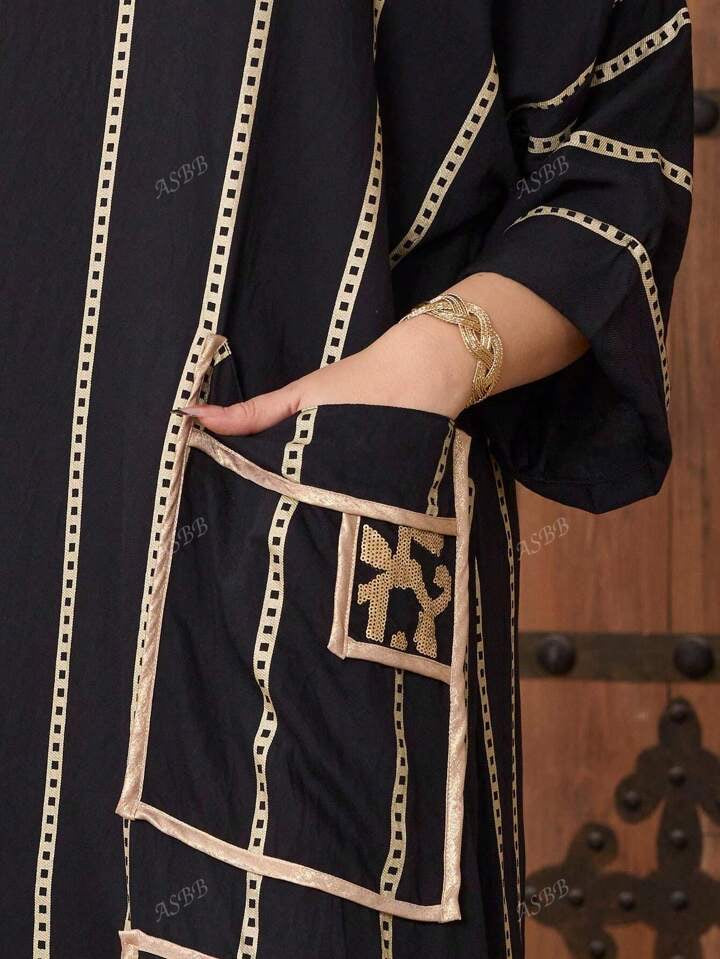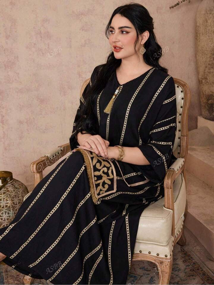 Elegant Embroidered Patterned Arabic Style Women's Dress With V-Neck