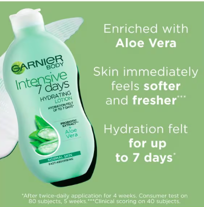 Our Garnier Intensive 7 Days Aloe Vera Lotion helps the hydrating needs of normal skin. This desert plant has the capacity to survive for months in arid climates, without water. It produced a gel, rich in vitamins and minerals, known for its highly hydrating properties.Refreshing: Garnier Intensive 7 Days Aloe Vera Body Lotion Hydrates Skin Leaving It Feeling Instantly Soft And Fresh.