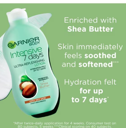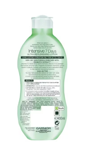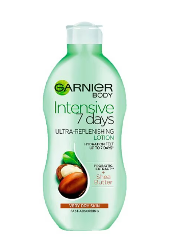 Garnier Intensive 7 Days Shea Butter Lotion & Hand cream helps the replenishing needs of very dry skin. Harvested from the shea tree in West Africa, it is rich in essential nutrients known to build skin lipids to replenish and soften extra-dry skin.