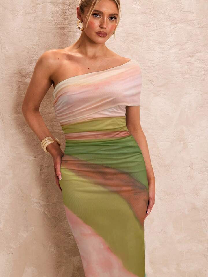 Glamine Women's Summer Green Tie-Dye Slit Mesh Panel Mini Dress