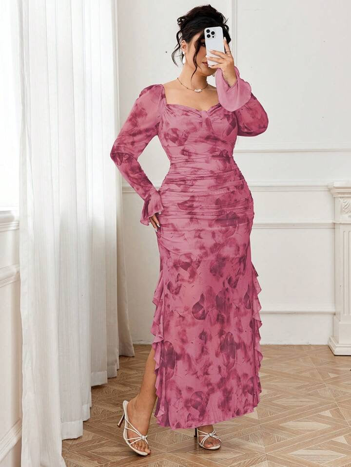 Modelyn Plus Size Women Floral Print Ruffles Slit Hem Elegant Dress
