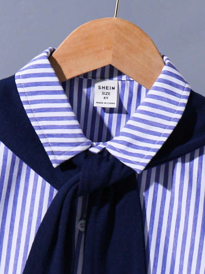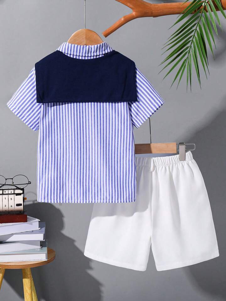 SHEIN 4pcs Set Young Boy Summer Cute Striped Short Sleeve Shirt, Elastic Waist Shorts, Cape, With Belt