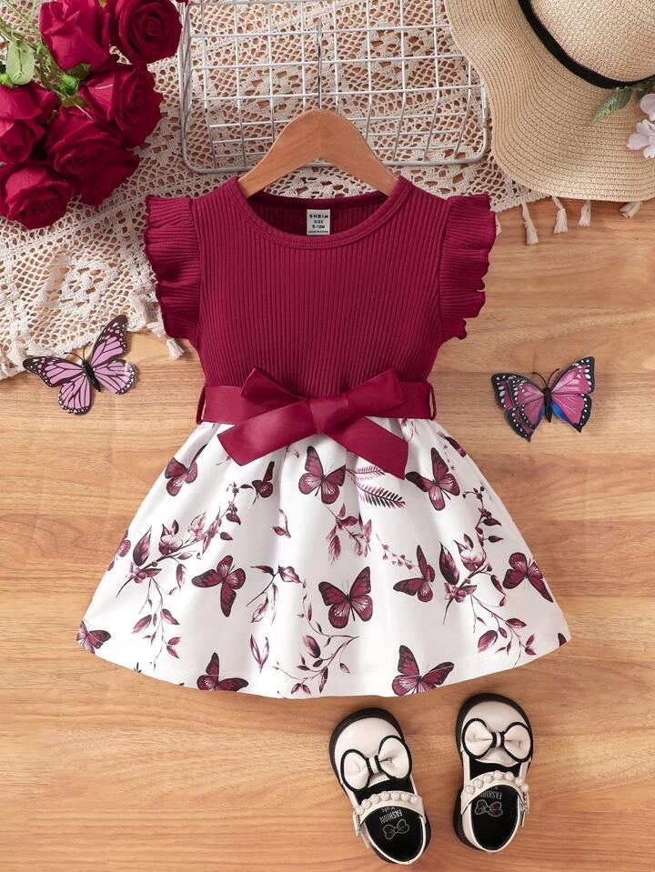 SHEIN Baby Girls Casual Everyday All-Match Cute Butterfly Print Dress With Belt