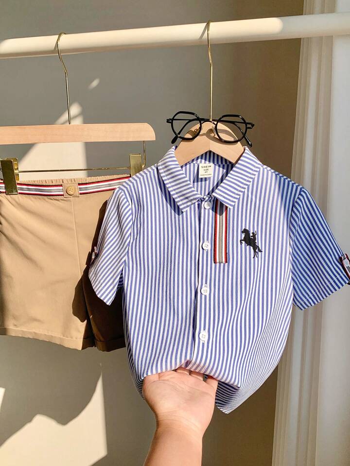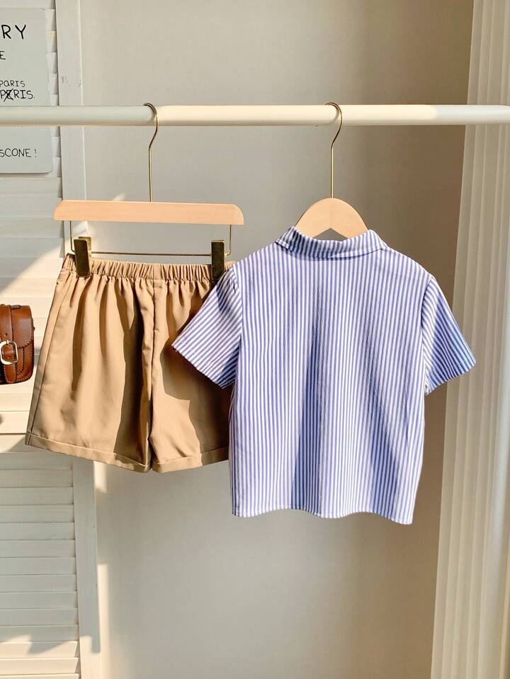 SHEIN Young Boy 2pcs/Set Value Bundle Casual Sports Preppy Colorful Stripe Trim Polo Collar Short Sleeve Shirt And Khaki Woven Shorts