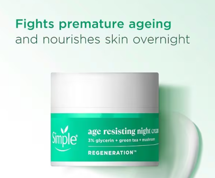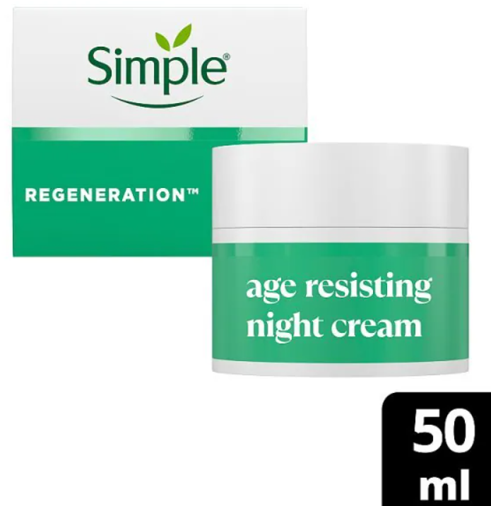 Simple Regeneration Age Resisting Night Cream is a powerful moisturiser for overnight skin rejuvenation. It's enriched with 3% Glycerin, Green Tea, and Mushroom Extract that work harmoniously to replenish your skin while you sleep. This night cream is an effective blend that helps reverse the early signs of ageing, leaving your skin feeling smooth, nourished and youthful-looking. Simple has been creating skin-friendly products since 1960, always excluding harsh chemicals from our formulations. Our Age Resisting Night Cream is no different.