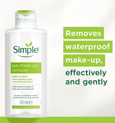 We'Ve Got You Covered! Simple Kind To Skin Eye Make-Up Remover Effortlessly Takes Off Eye Make-Up In One Go, Even Waterproof Mascara. The Oil-Free Formulation Of Our Gentle Eye Make-Up Remover Soothes The Delicate Eye Area With Skin-Loving Ingredients That Are Also Suitable For Contact Lens Wearers. The Skin Around Your Eyes Is Really Delicate, Which Is Why It Needs Some Proper Tlc. Our Eye Make-Up Remover Is Ideal For All Skin Types, Even Sensitive Skin. This Simple Product Is Made With The Perfect Blend Of Gentle Cleansers And Contains Multi-Vitamins Like Vitamin E And Pro-Vitamin B5. Our Simple Eye Make-Up Remover Contains No Artificial Perfume, Colour Or Alcohol And No Harsh Chemicals That Can Upset Your Skin. We Believe In Continuously Working To Be Kinder To The Planet. That'S Why Kind To Skin Eye Make-Up Remover Is Peta Certified Cruelty-Free And Vegan. Globally, Simple Does Not Test On Animals. Our Eye Make-Up Remover Also Comes In Post-Consumer Recycled (Pcr) Plastic Bottles That Are 100% Recyclable With Their Lids. Our Eye Make-Up Remover Is Both Dermatologically And Ophthalmologically Tested. So Whether You’Re Wearing Make-Up Day Or Night