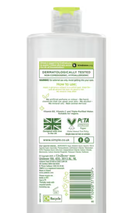 This Simple cleanser uses millions of micelles to attract and lift make-up and impurities off your face, leaving your skin hydrated for up to 4 hours. Our Simple Micellar Water not only instantly boosts skin’s hydration by 90%, it also cleanses without leaving a greasy residue, so there's no rinsing required. Your skin will feel clean, fresh and instantly hydrated. Designed for sensitive skin and perfect for all skin types, Simple Micellar Cleansing Water is made with skin-loving ingredients including vitamin B3, vitamin C and triple-purified water – our purest water that provides instant hydration to help the skin get through the day. It contains no artificial perfumes or colours, and no harsh chemicals that can upset your skin. What’s more, this bottle is made from 100% post-consumer recycled (PCR) plastic and is 100% recyclable with its lid.Â